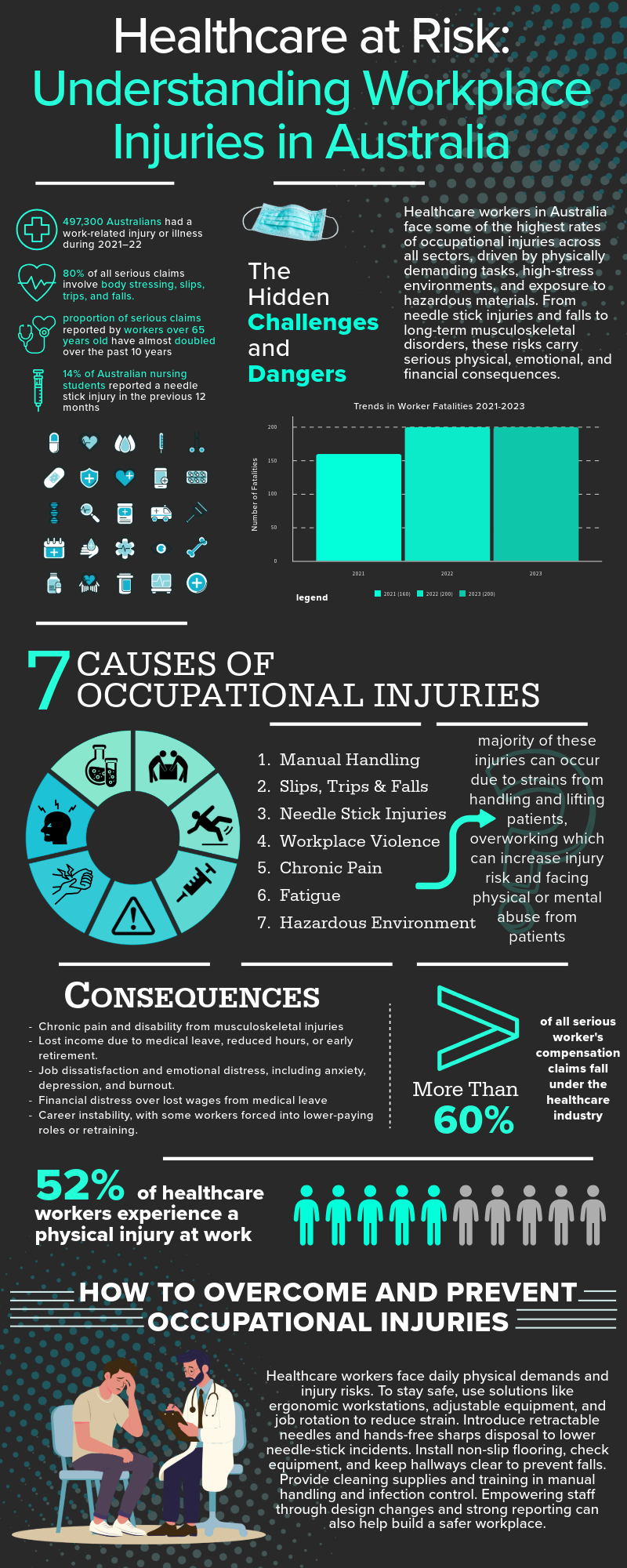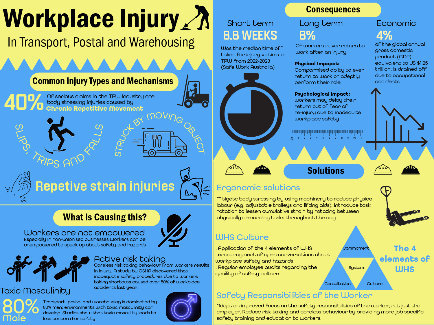 Assessment 2 has been redesigned as an individual task where students create an infographic using Adobe Express to visually present data on occupational injuries within a key Australian industry. This task encourages students to synthesize complex data into an accessible format, fostering digital literacy, data visualization, and visual communication skills. The expected impact on students is to develop proficiency in creating and communicating health and safety information effectively using digital tools—preparing them for technology-driven workplaces.